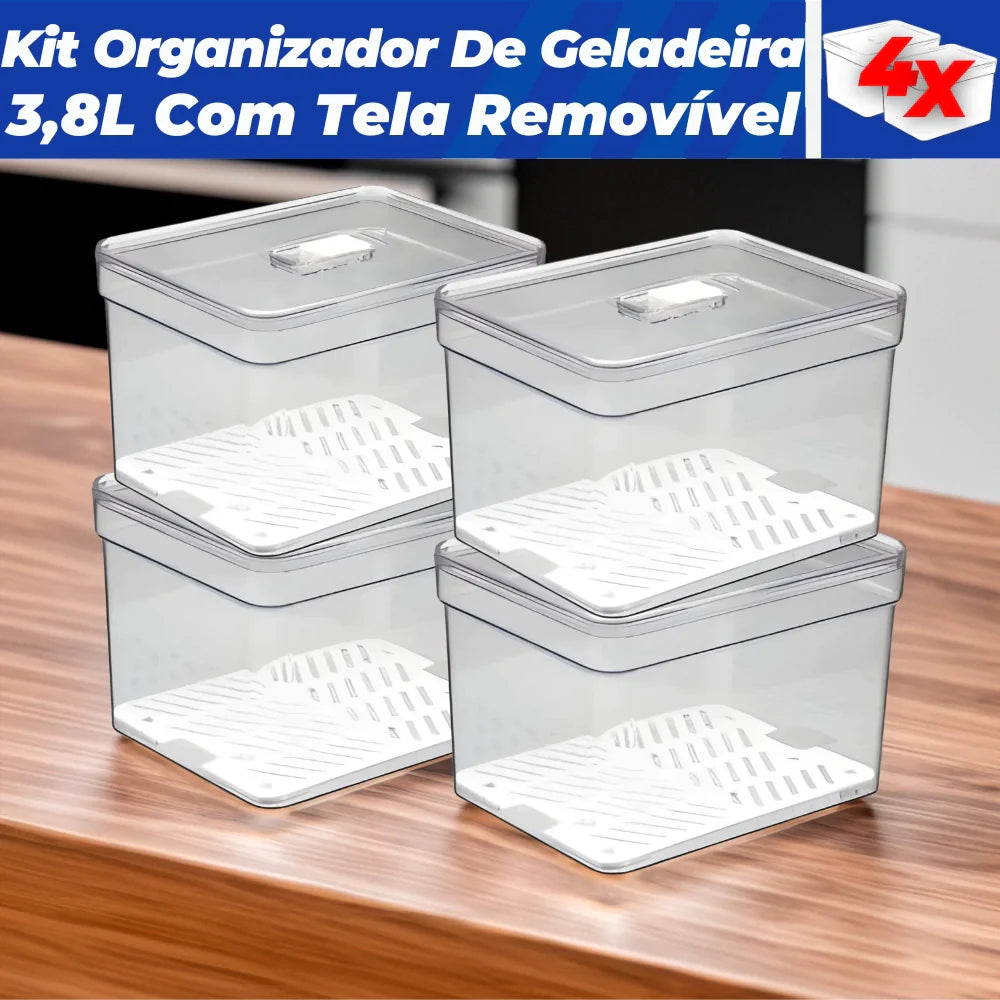 Apresentamos o Kit de 4 Organizadores de Geladeira, com capacidade de 3,8 litros cada.