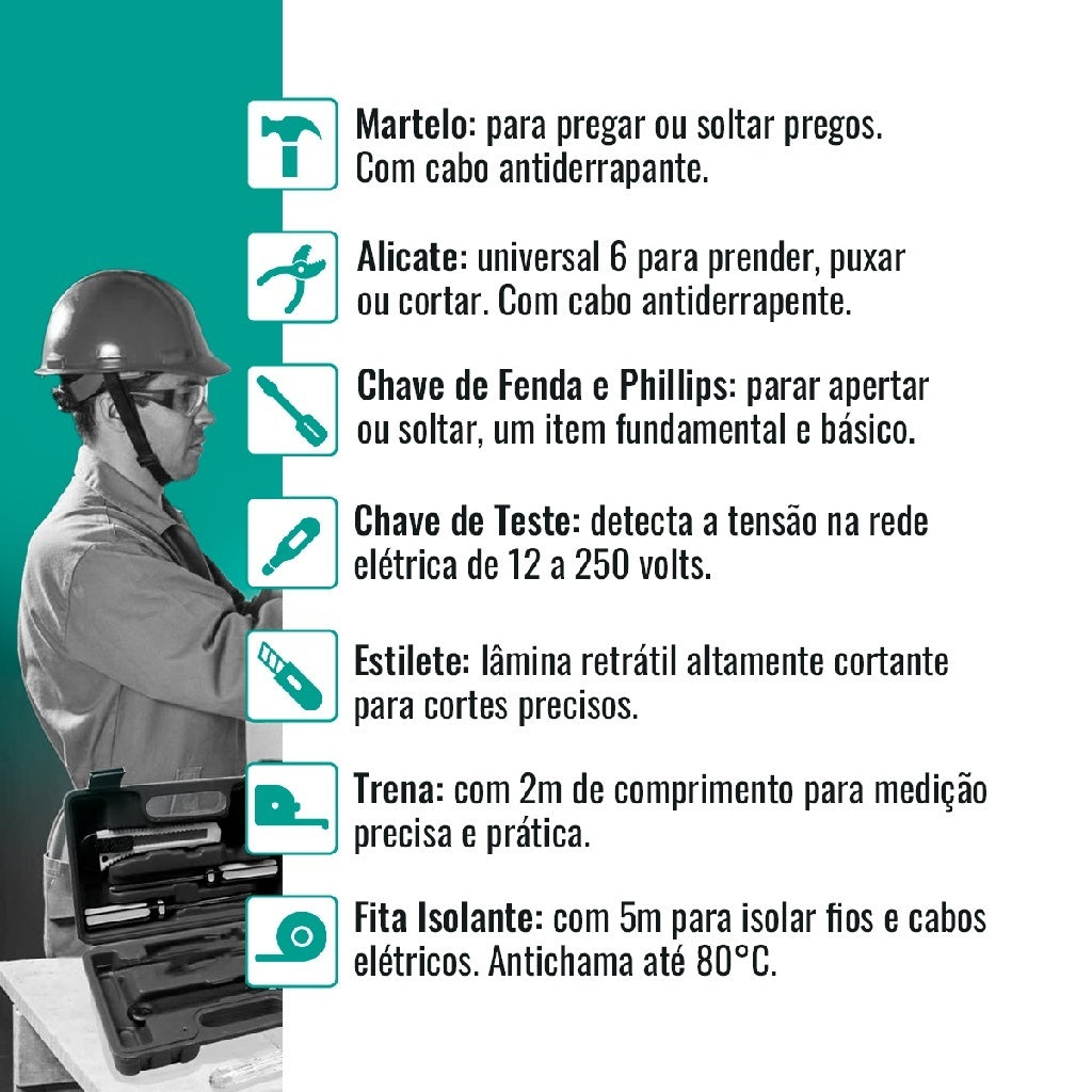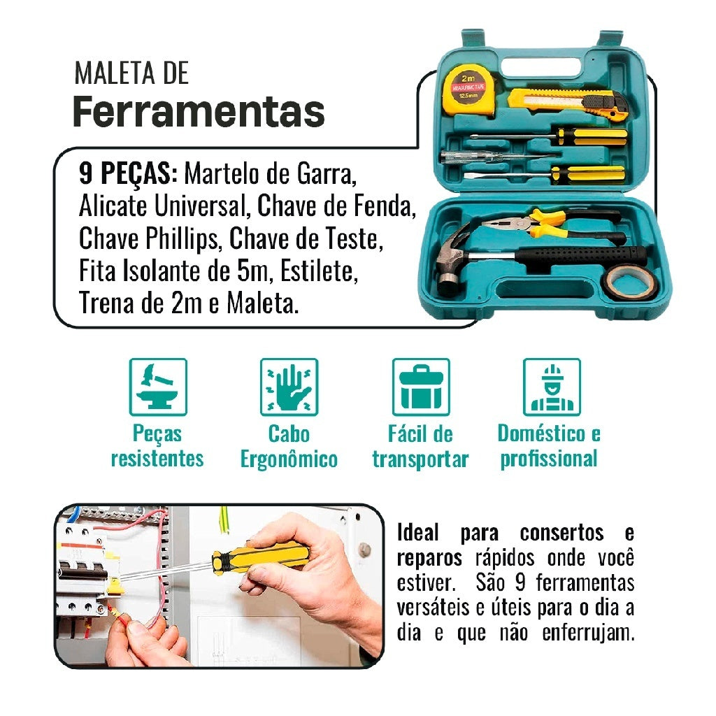 Kit compacto e resistente com 9 ferramentas essenciais para pequenos reparos do dia a dia.