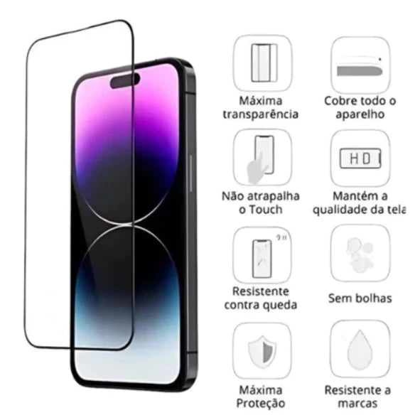 A proteção definitiva para a sua tela. Esta película de vidro temperado foi projetada para resistir a riscos, quedas e impactos do dia a dia, mantendo a sensibilidade ao toque e a clareza da tela HD intactas. Com o kit de limpeza que acompanha, a aplicação é simples, rápida e livre de bolhas.
